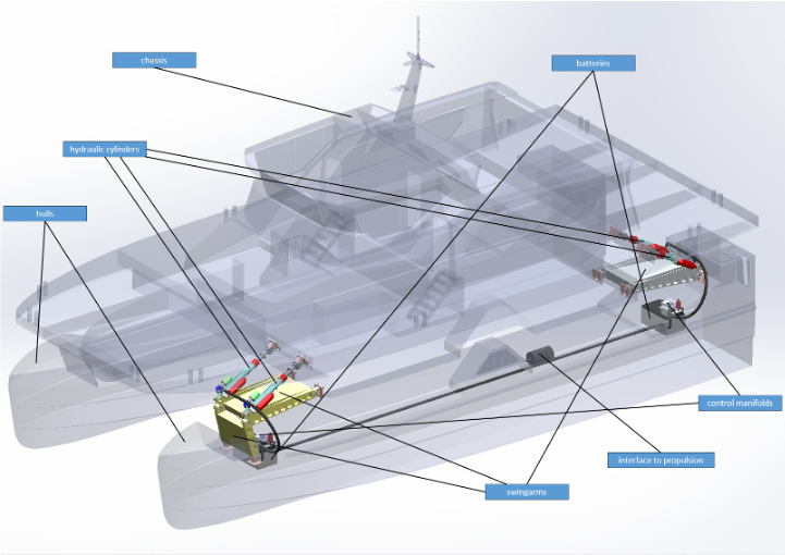 Support hydraulics and motor controllers are mounted directly to the cylinders for high-response control with hydraulic and electrical lines connecting to batteries and manifolds housed in the hulls.