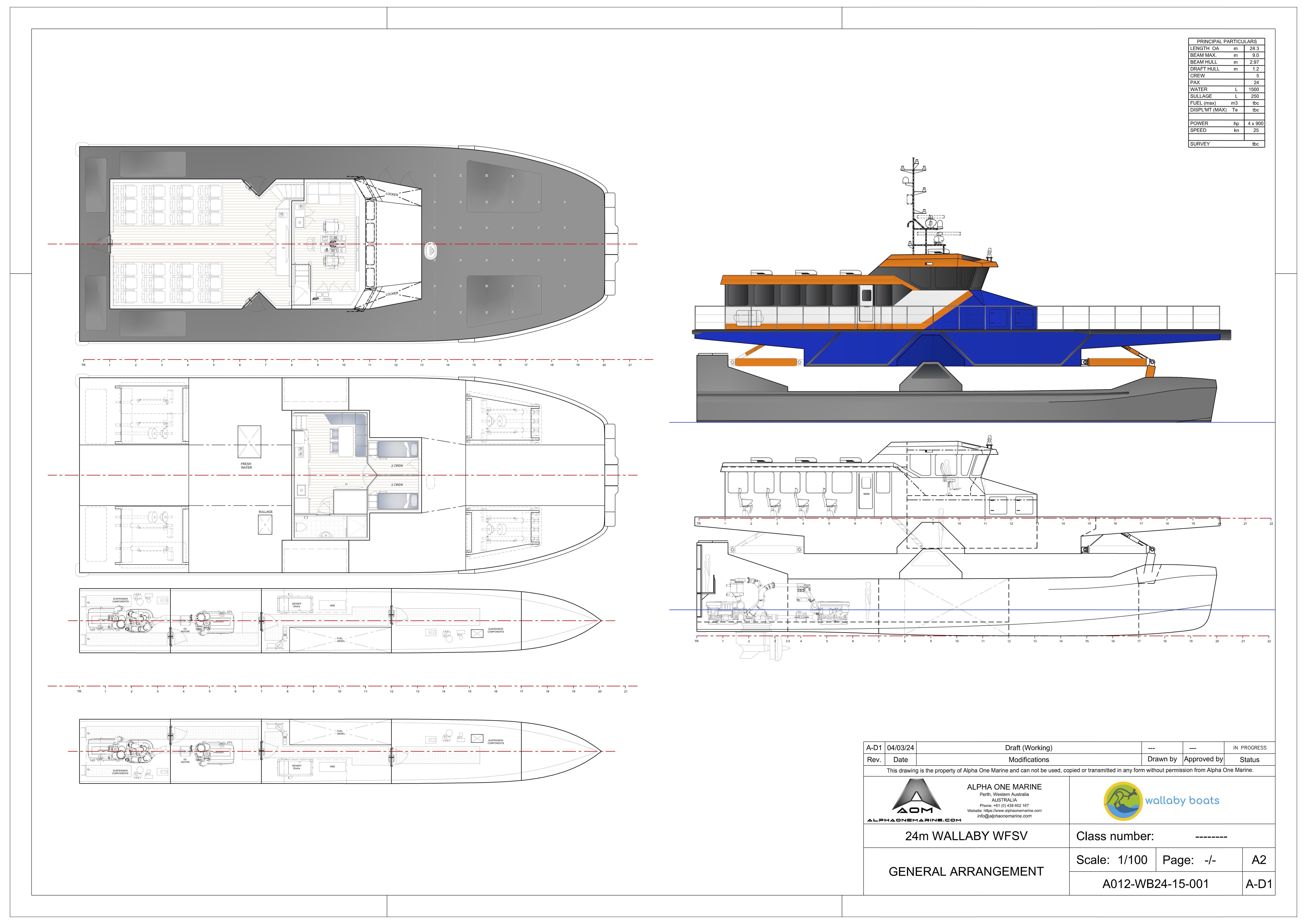 The Wallaby-24hybrid is our latest design of a high performance catamaran that can be used as an economically sized CTV for near shore OWF or on far offshore OWF in combination with a Service and Operation Vessels (SOV), as they will be used e.g. on Dogger Bank offshore wind farms or in further out parts of the German sector etc.. As a result to its rather small dimensions for a high performing CTV, supported by the energy recovery system the Wallaby-24 is a powerful yet economic vessel. Passenger comfort, economy and carbon footprint of the WB-24hybrid are stunning. It compares in wave performance to 30m and larger catamarans but CAPEX, OPEX and carbon footprint are significantly lower (50%-60%) at same or even better wave performance. The WB-24hybrid is suited with accommodation sleeping four crew members thus allows for highes flexibility in dispatch location and even for several days at sea.